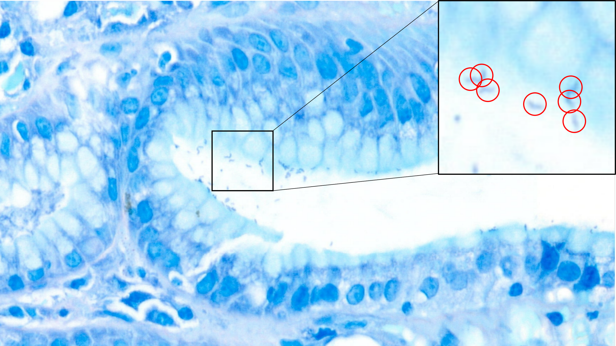 All routine gastric biopsies are screened for the presence of Helicobacter bacteria. Helicobacter infections, mainly by H. pylori, may cause gastric or duodenal ulcers and are associated with the development of gastric carcinoma and gastric lymphoma. Detection of the bacteria by conventional light microscopy in gastric tissue remains the gold standard for the diagnosis but can be challenging and time-consuming. In addition, our own preliminary results demonstrate that detection of Helicobacter bacteria on whole slide images is more challenging compared to conventional microscopy. Aim of the project is to generate an image analysis algorithm using deep learning to automatically detect the presence of Helicobacter bacteria in whole slide images in gastric biopsies.